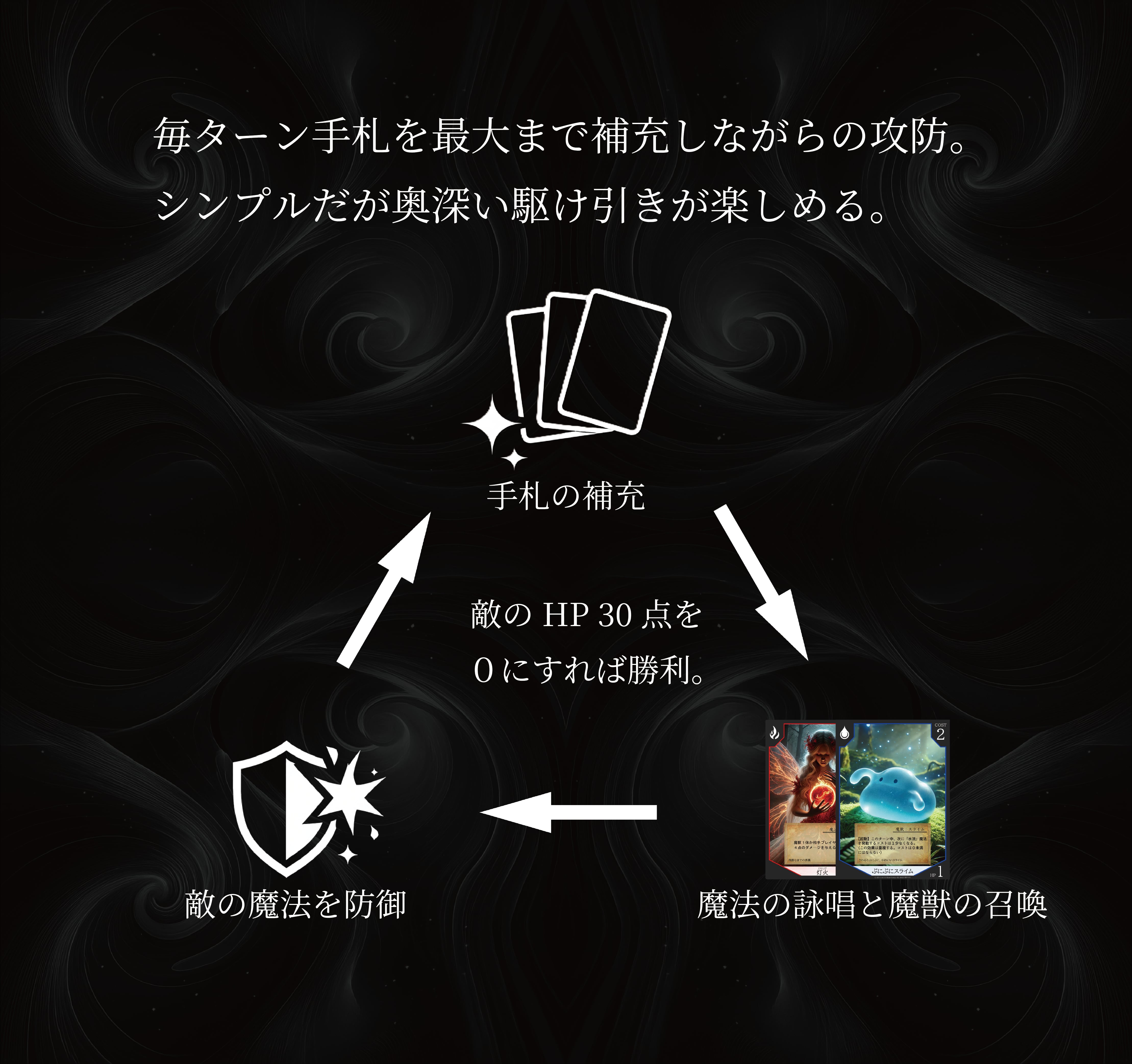 相手のターンにできるのは、基本的に魔法の威力を弱めることだけ。シンプルな読み合いで、TCG初心者の方にも楽しんでいただけます。